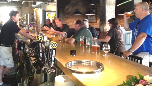 Mitchell gave us the full tour, with fresh taps right from the source, and another full roll-out in the upstairs tap room, which we had all to ourselves. Notice the bottling line up above. In all our trips, we have found that many of our favorite breweries have bottling lines older than anyone in our tour group. Hinterland is no exception!